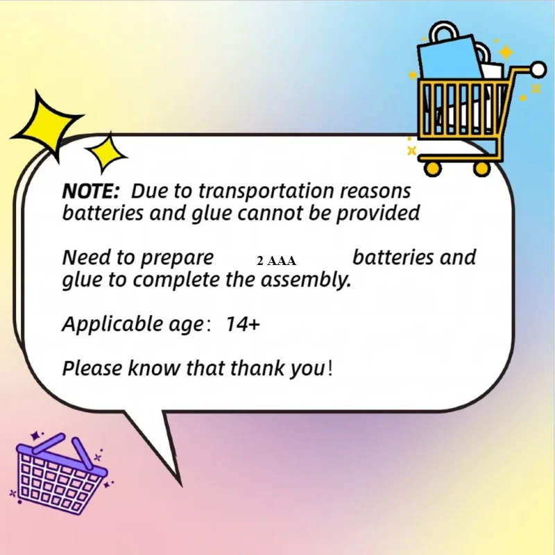 1 、 Debido a las restricciones de transporte, no se pueden proporcionar baterías y pegamento, debe preparar baterías y pegamento para completar el montaje.