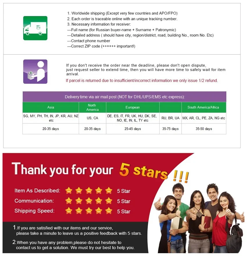 Los paquetes de nuestro almacén en China serán enviados por ePacket o EMS dependiendo del peso y tamaño del producto. Los paquetes enviados desde nuestro almacén de EE. UU. Se envían a través de USPS.
