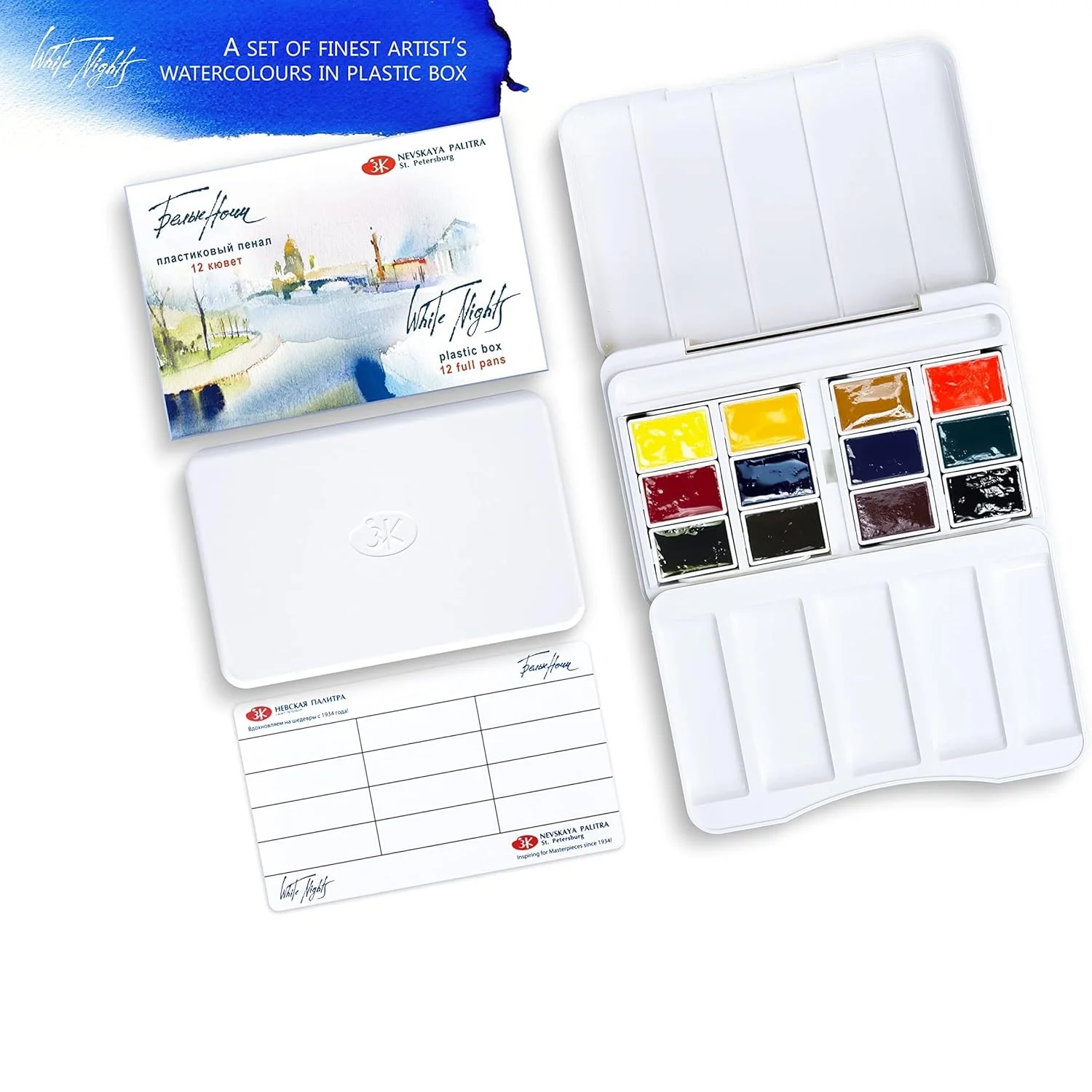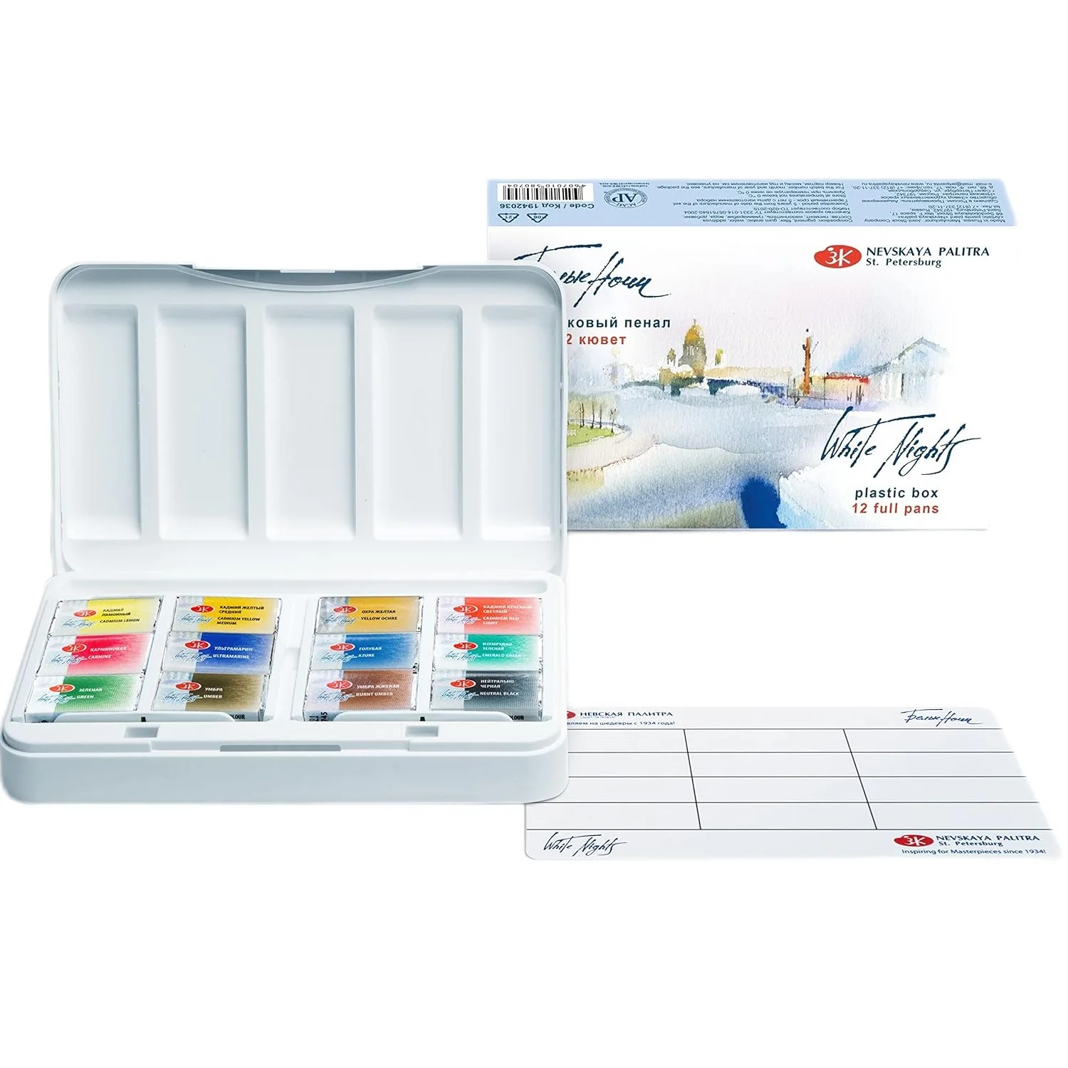 Watercolor Set – 12 Full Pans-201 Cadmium Yellow Medium, 203 Cadmium Lemon, 218 Yellow Ochre, 302 Cadmium Red Light, 319 Carmine, 511 Ultramarine,513 Azure, 713 Emerald Green,725 Green,418 Umber, 408 Burnt Umber, 805 Neutral Black