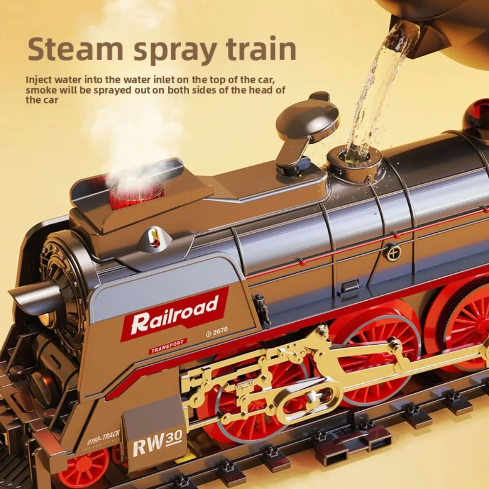 Pista de tren de vapor retro, 3 rociadores de vapor/2 luces/control remoto eléctrico/adelante/atrás, simulación de sonido de silbato de vapor, pista de empalme de bricolaje, configuración de automóvil con batería de litio
