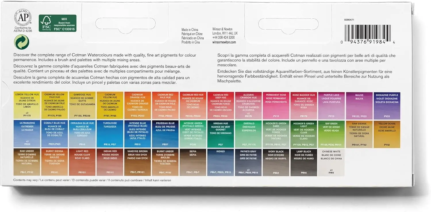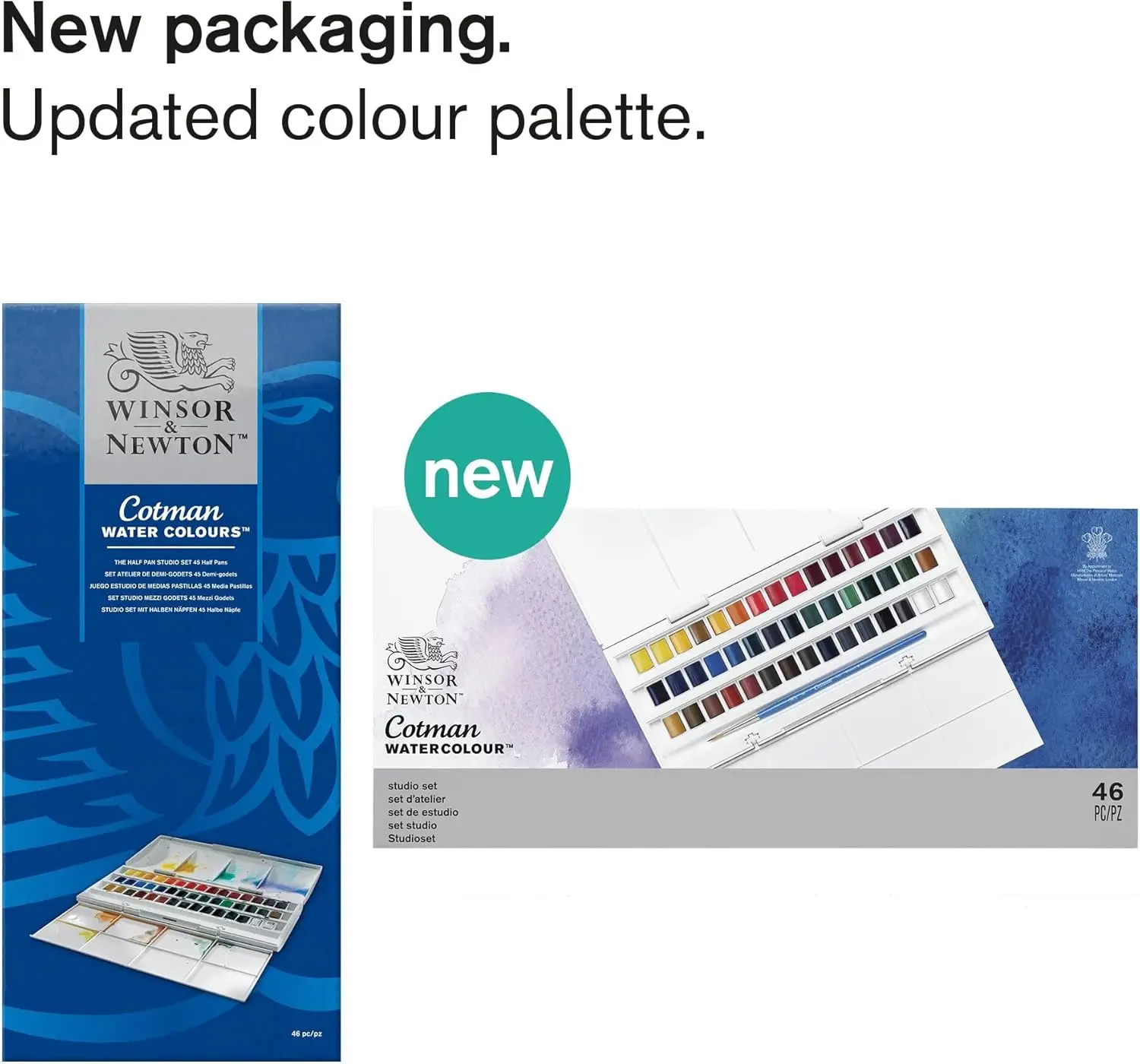 Winsor&Newton Cotman Watercolor Paint Set Studio Set 45 Half Pans with Painting Brush Palette Artists Portable Drawing Supplies