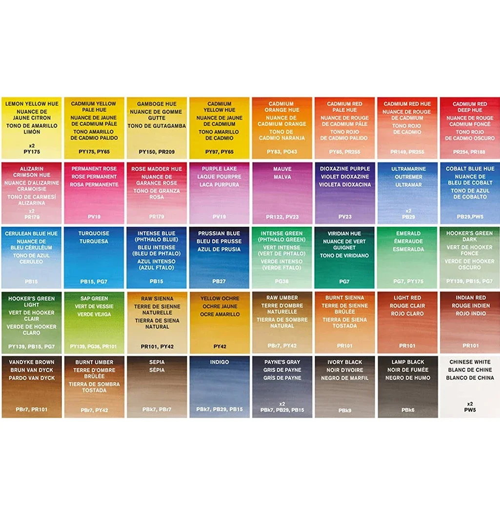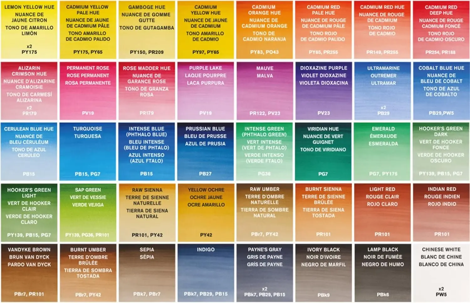 CADMIUM YELLOW, GAMBOGE HUE,CADMIUM YELLOW HUE, CADMIUM ORANGE HUE, CADMIUM RED PALE HUE, CADMIUM RED HUE, CADMIUM RED DEEP HUE,PERMANENT ROSE, ROSE MADDER HUE, PURPLE LAKE, MAUVE, DIOXAZINE PURPLE, COBALT BLUE HUE, CERULEAN BLUE HUE, TURQUOISE, INTENSE BLUE(PHTHALO BLUE), PRUSSIAN BLUE, INTENSE GREEN(PHTHALO GREEN), VIRIDIAN HUE,ENERALD, HOOKER'S GREEN DARK, HOOKER'S GREEN LIGHT, SAP GREEN, RAW SIENNA, YELLOW OCHRE,